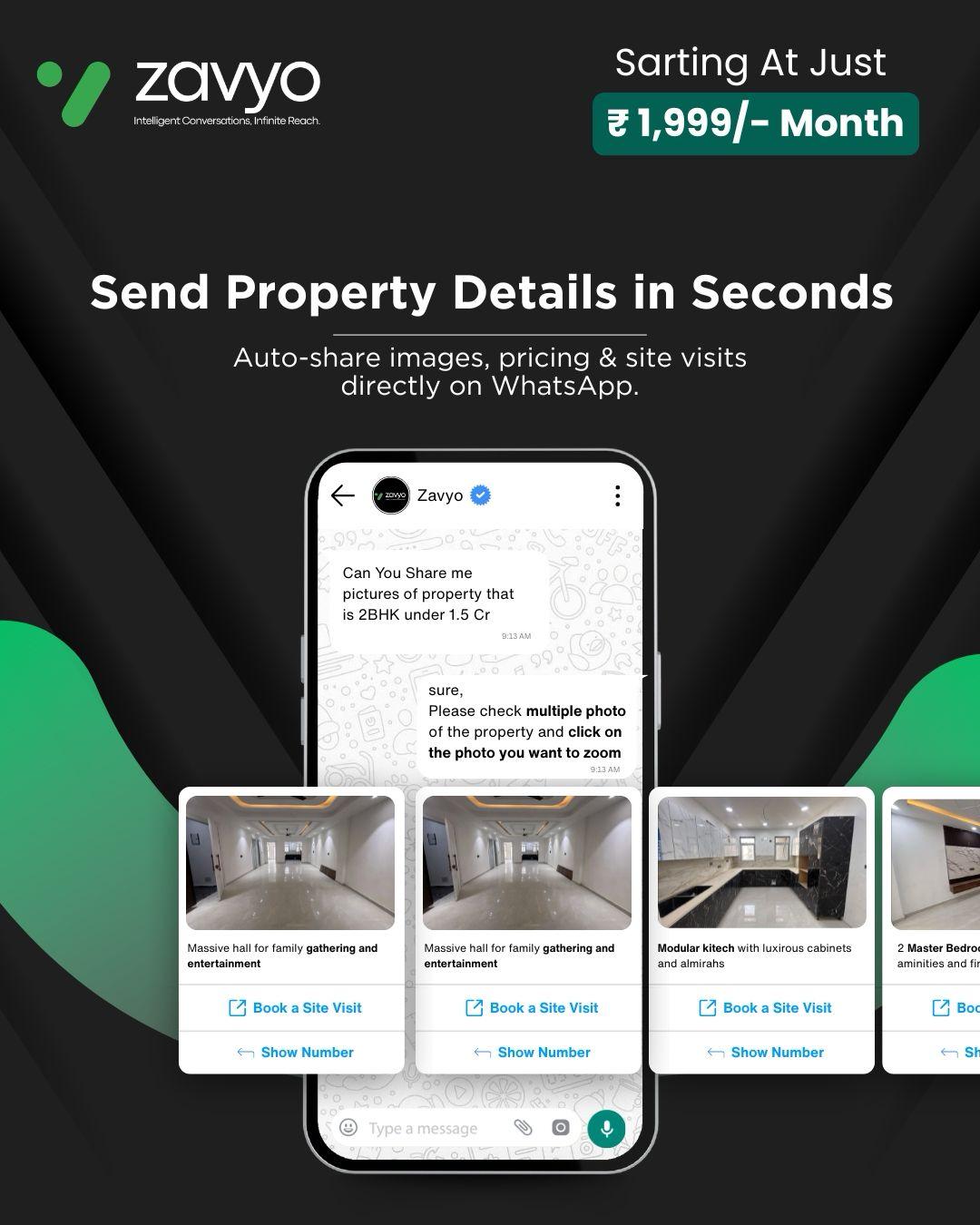 Send property details in seconds right where your clients already are. Automate images, pricing, and site visits on WhatsApp with Zavyo. Start growing your real estate business today at just ₹1,999/month!